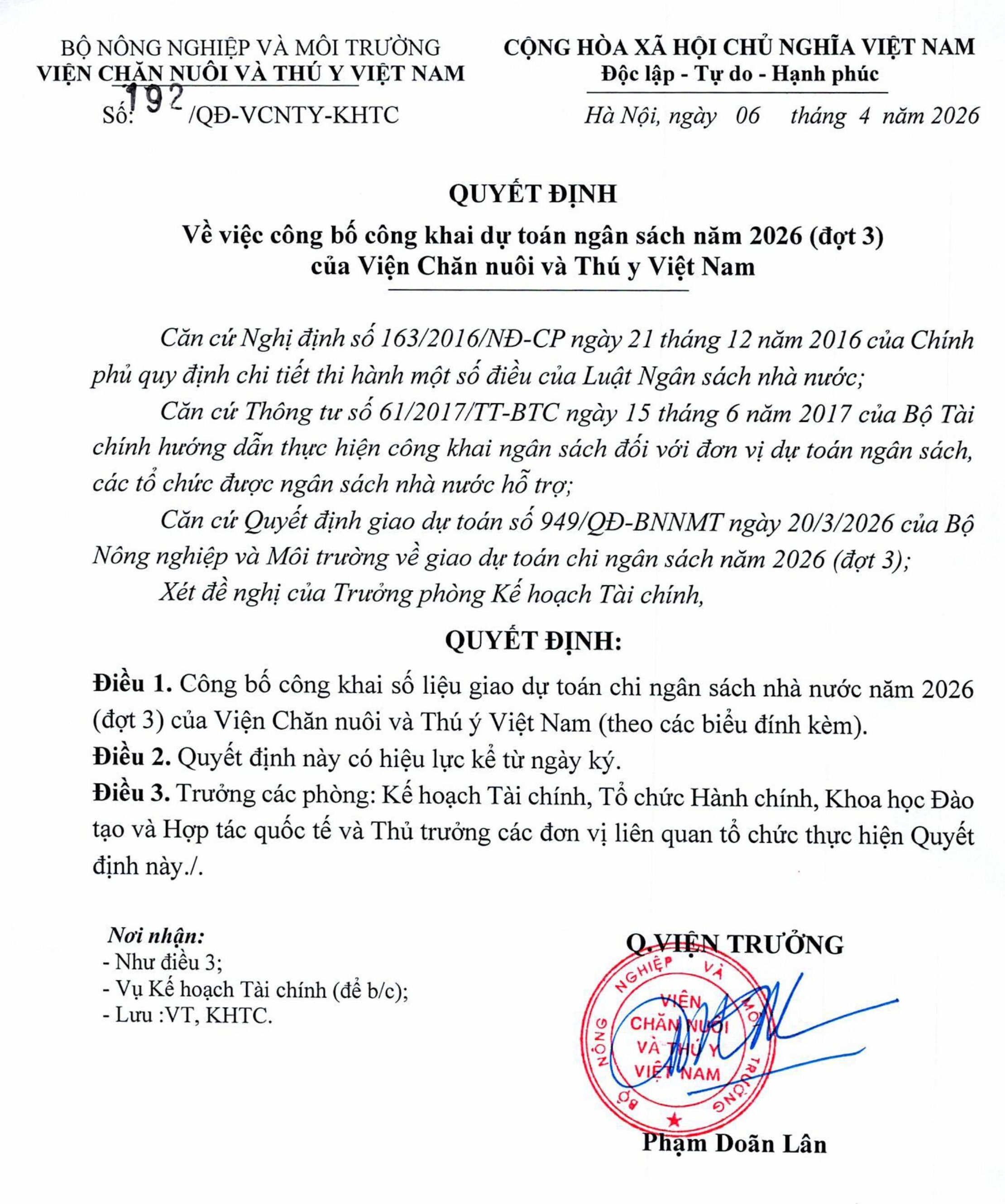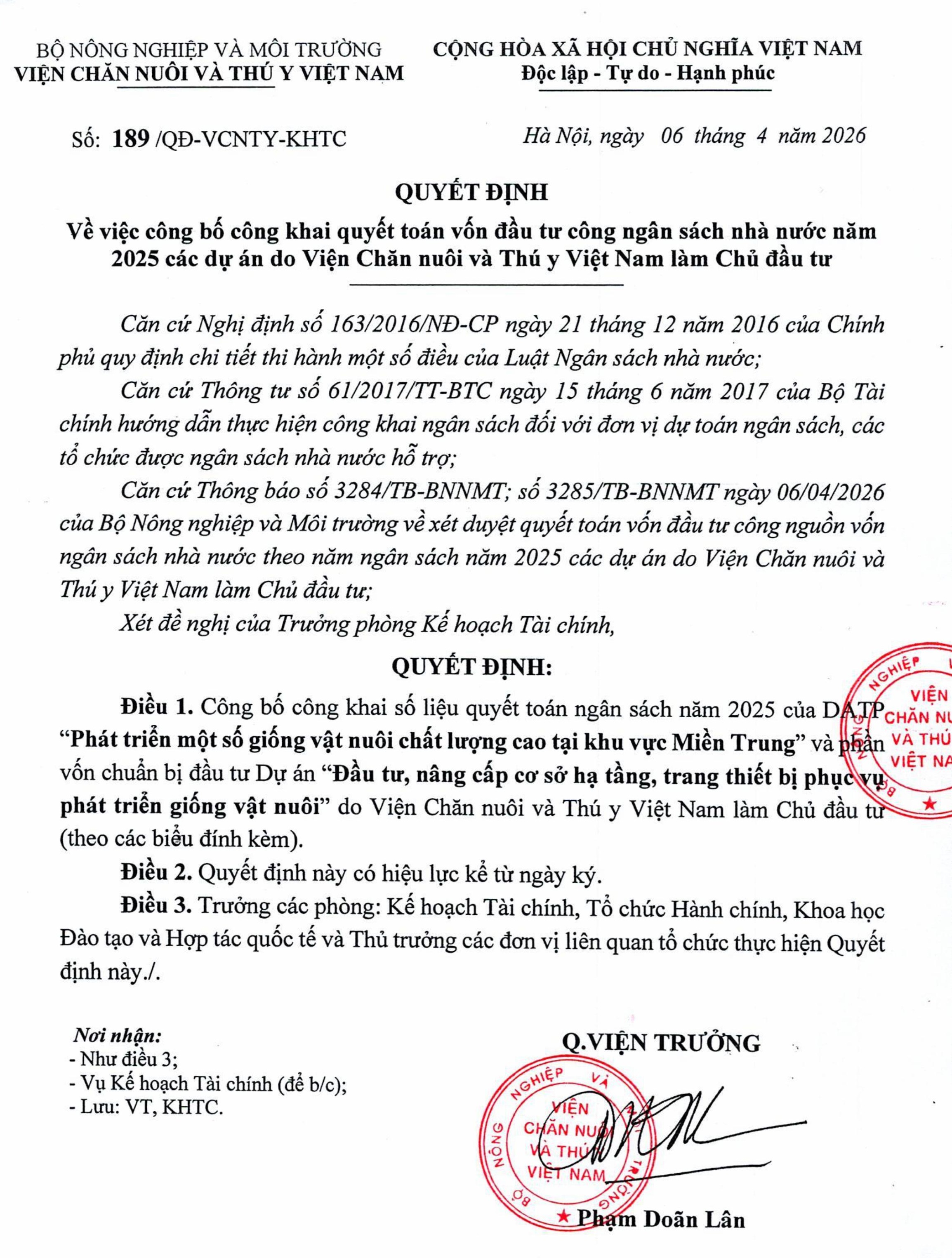 - QĐ số 189 về việc công bố công khai quyết toán vốn đầu tư công ngân sách nhà nước nặm 2025 các dự án do Viện Chăn nuôi và Thú y Việt Nam làm Chủ đầu tư 09/04/2026