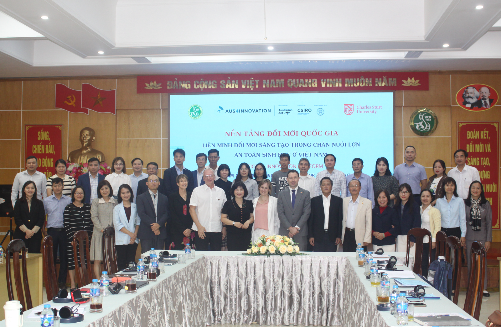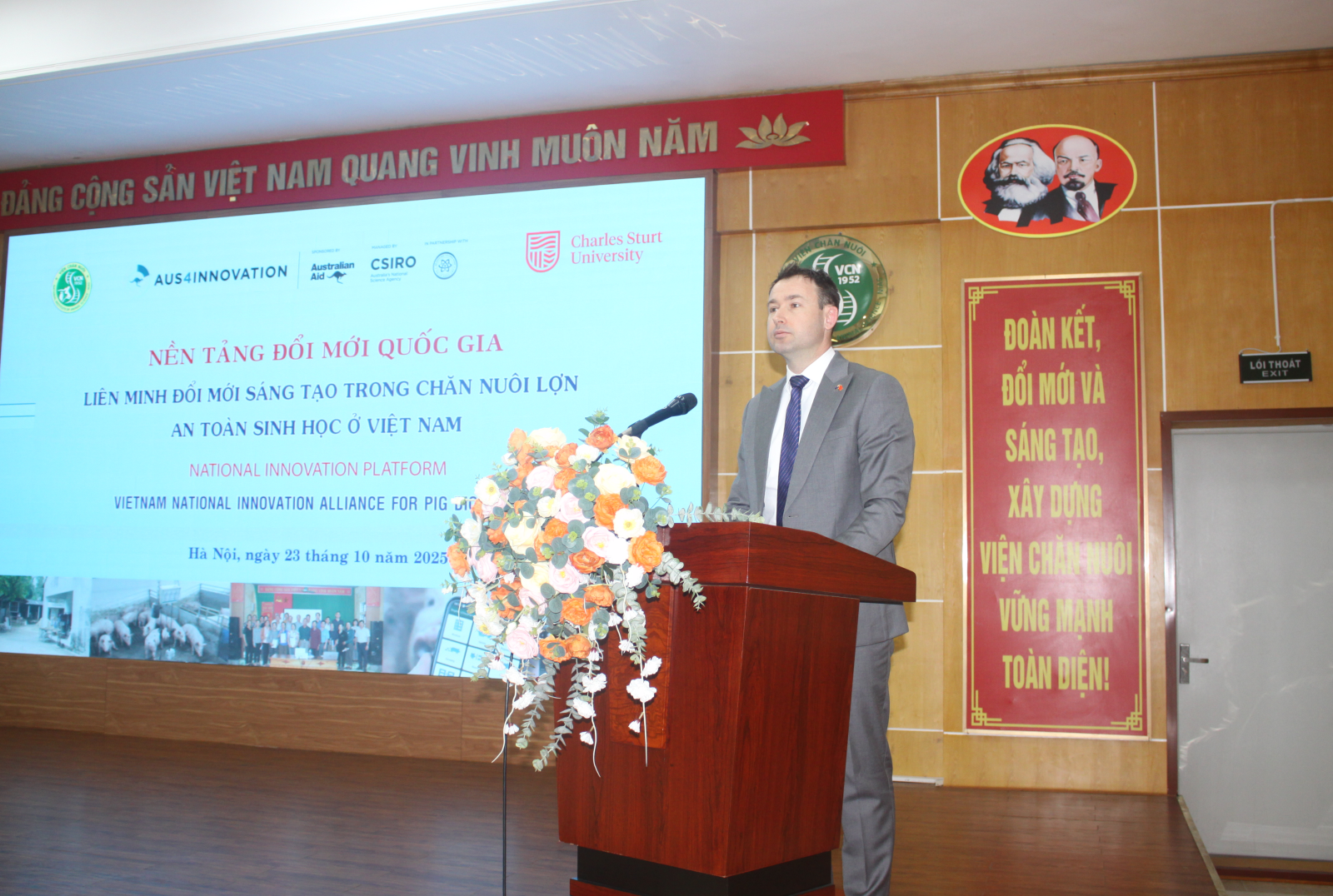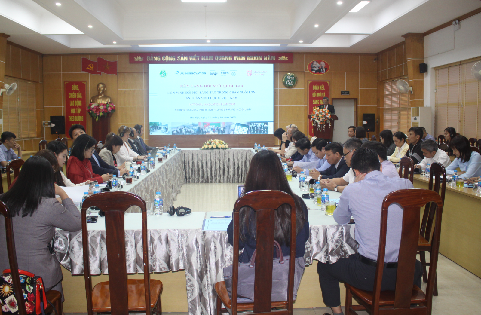 Trong khuôn khổ hợp tác giữa Viện Chăn nuôi và Chương trình Aus4Innovation (A4I) – Australia (chính phủ Úc) triển khai Dự án “Liên minh đổi mới sáng tạo trong chăn nuôi lợn an toàn sinh học ở Việt Nam”. Sáng nay ngày 23/10/2025, Viện Chăn nuôi tổ chức “Hội nghị Liên minh Đổi mới sáng tạo trong chăn nuôi lợn an toàn sinh học ở Việt Nam”, Hội nghị được tổ chức tại Hội trường của Viện Chăn nuôi, số 9 Tân Phong, P. Thượng Cát, TP. Hà Nội. Chương trình do Tổ chức Khoa học và Nghiên cứu công nghiệp khối thịnh vượng chung (CSIRO) tài trợ; Viện Chăn nuôi là đơn vị thực hiện.