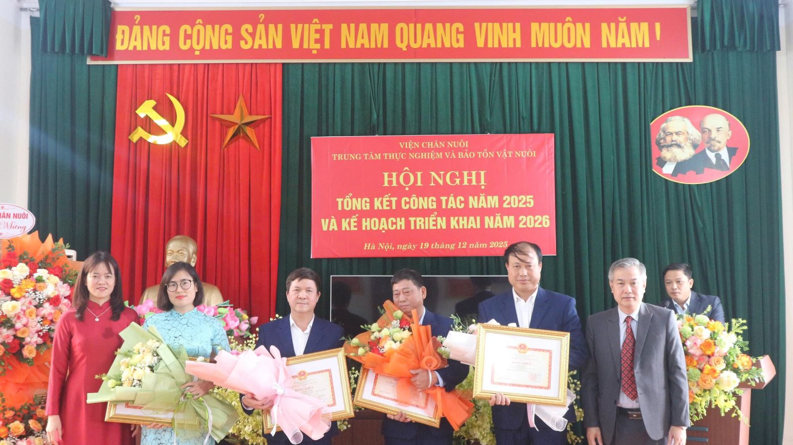 Quyền Viện trưởng Viện Chăn nuôi PGS.TS. Phạm Doãn Lân và Giám đốc Trung tâm trao thi đua khen thưởng cho cá nhân đạt danh hiệu thi đua