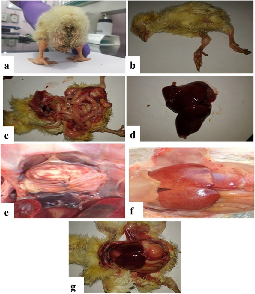 Triệu chứng lâm sàng và bệnh lý đại thể sau nhiễm khuẩn Salmonella Typhimurium: (a) Dịch tiết hậu môn (b) Lông xù (c) Xuất huyết ruột (d) Gan đổi màu đồng (e) Tổn thương dạng nốt trắng nổi trên tâm thất (f) Các ổ hoại tử rõ rệt trên gan (g) Gan to