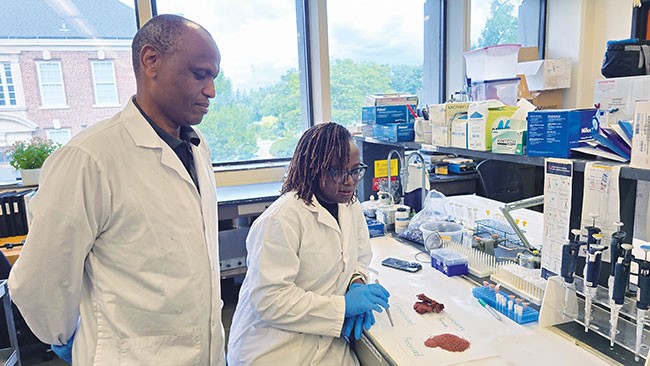 Elijah Kiarie (bên trái) và nghiên cứu sinh tiến sĩ Lonita Manoa đang tìm hiểu tiềm năng của chất chống oxy hóa trong bã trái cây để hỗ trợ kéo dài thời gian đẻ trứng. Ảnh: Sylvester Mutinda