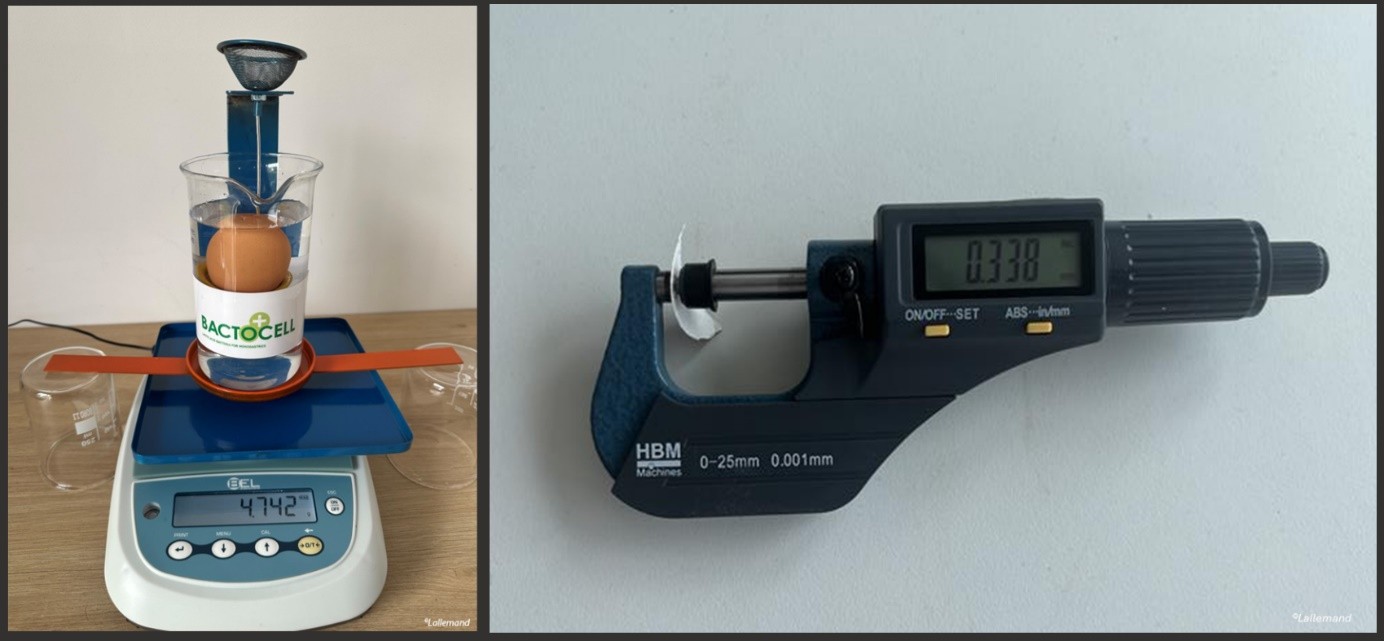 Minh họa các kỹ thuật đánh giá chất lượng vỏ trứng: đánh giá trọng lượng riêng của trứng không xâm lấn bằng thiết bị chuyên dụng do Lallemand phát triển (bên trái) và đo độ dày vỏ trứng xâm lấn bằng vít vi mô (bên phải)