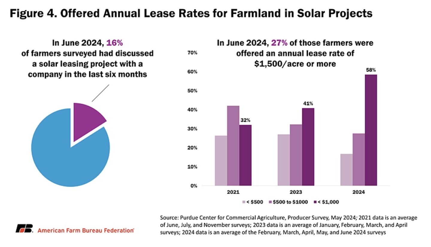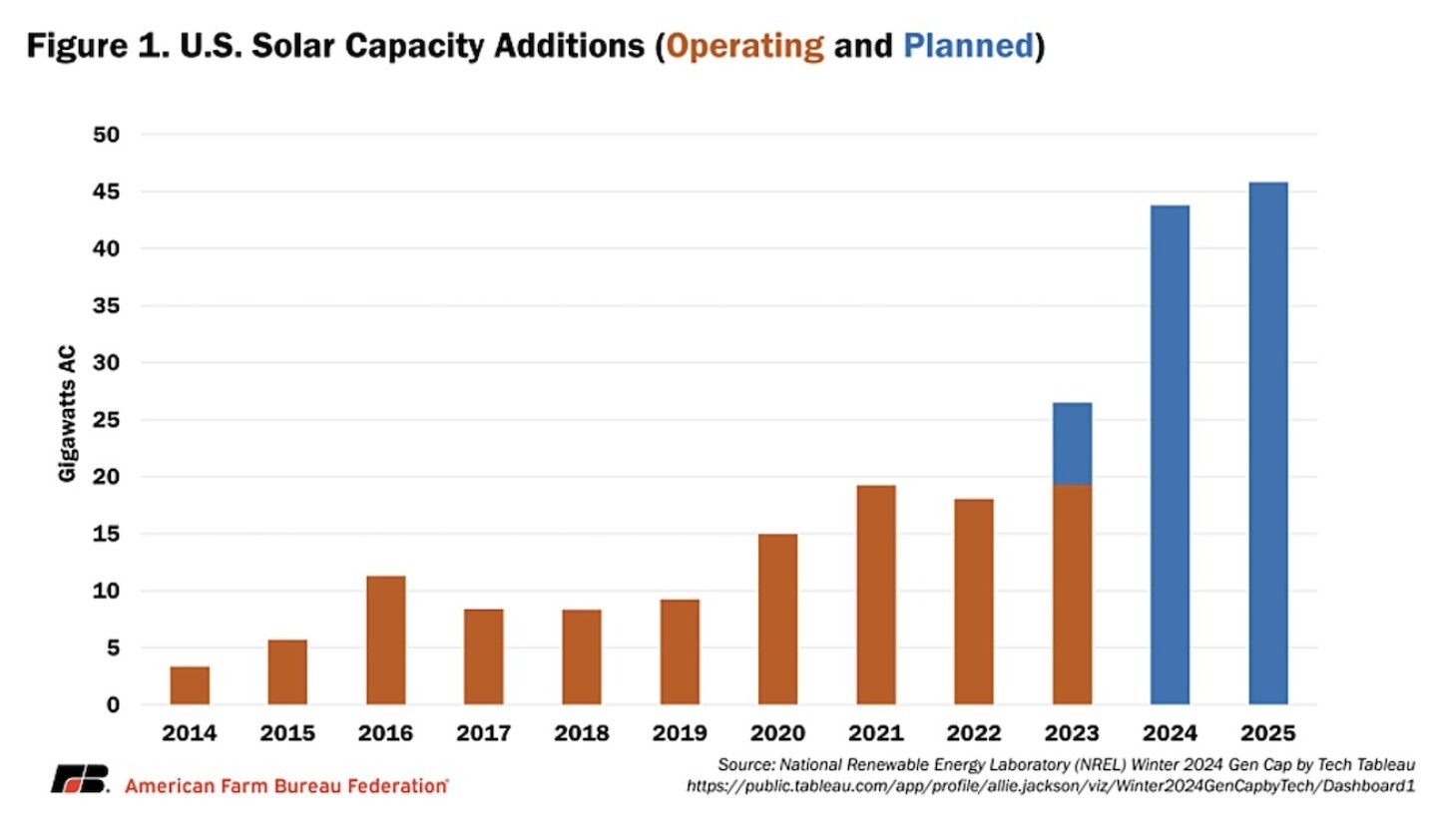 Tính đến năm 2024, Liên đoàn Nông trại Hoa Kỳ ước tính hơn 1,25 triệu mẫu đất nông nghiệp đã được lắp đặt hệ thống năng lượng mặt trời: